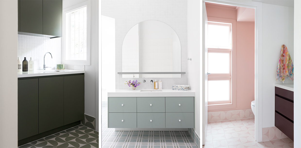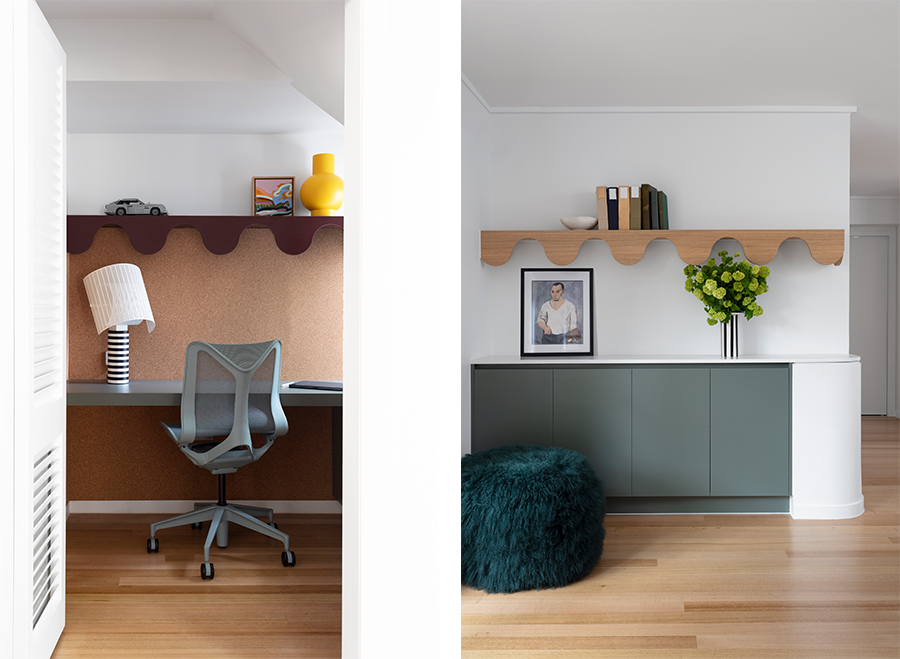 Working with her clients, Langlois delivered colour and life, never letting it feel overly pragmatic or functional, but lacking for neither. Flourishes and special touches, like the wavy door handles and shelves, repeat the motif adding fun and wit but aren’t novel or unnecessarily quirky. In Laminex Sublime Teak and Laminex Kalamata, these touches demonstrate the flexibility of the product, while simultaneously providing the practical benefits of Laminex – hardwearing, as well as stain and water resistant. The galley element of the kitchen, as well as cabinetry throughout the house continues the use of Laminex Sublime Teak, thoughtfully connecting the home in theme and mood. Largely centred around Laminex Green Slate, the rich, deep green perfectly complements the woodgrain and other finishes throughout the home. In the bathrooms, ensuite, study-nook and laundry the tight palette selected from the Laminex Colour Collection ties the home together. Though this was a quick renovation, Langlois made sure no room was left untouched or didn’t fit the theme. So, in varying capacities we find Laminex Spinifex offering a paler green and subtle alternative to Green Slate, while elsewhere Laminex Kalamata bursts off the wall in two different pairings; as a wavy mantle above a green desk, or in the bathroom where painted pink walls are a warm, tonal accompaniment to the wine-like hue. “I like to think of myself as a designer that’s reflecting my clients. Obviously, I’m pulling it together, so there’s going to be some of me in it, but a successful project for me is that my clients know it’s their house and it’s representative of them.”