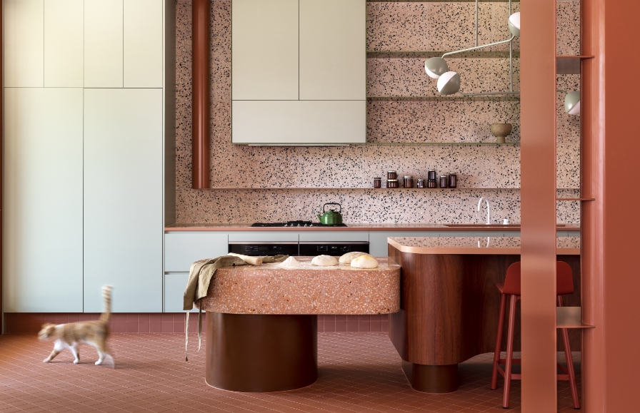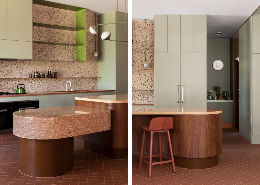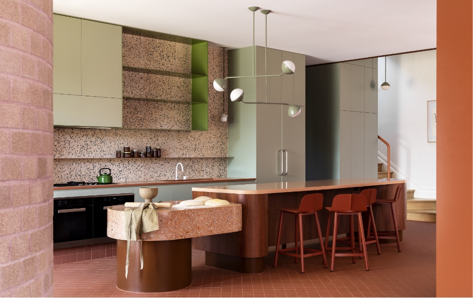 Part of the WOWOWA signature – and excellent advice for any designer – is design cohesiveness, repeating colours or motifs that connect one space to another. In this home, the wonderful, natural beauty of the garden is brought inside by Laminex Bayleaf green. It is teamed with earthy terracotta and warm terrazzo finishes on concave and convex curves that invite and draw you in. “We were keen to partner that with the browns and warm tones in the space… to tie it in and bring the whole house together,” says Woodward.