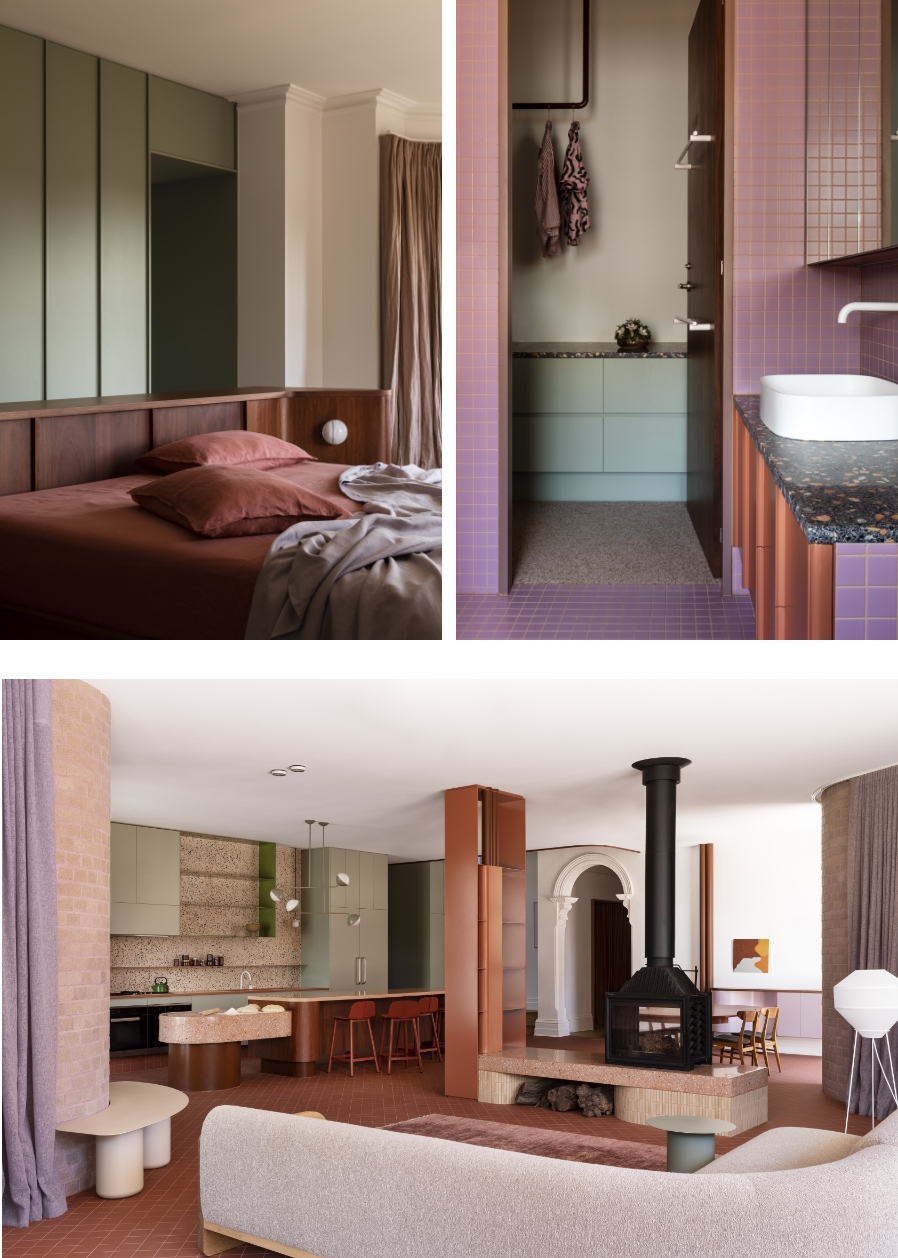 “The colour palette came from the [original] stained glass. They’re beautiful lavender, pink and green. It felt very Australiana,” explains Monique Woodward, WOWOWA’s Director. “The joinery also takes its cues from the geometric patterns, celebrating the existing details and archways of the old home.”