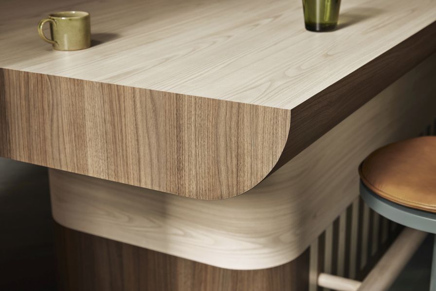 As Joachim explains, the island’s base was fabricated in two pieces, separated horizontally at the point where the woodgrain decors change. For each section, a skeleton was built by cutting sheets of medium-density fibreboard (MDF) on a CNC machine into the curved shape of the base, joining them with vertical slats and cladding them in Trade Essentials Craftform, a bendable grooved 9mm-thick MDF product. “We put ribs every 50mm so when we laid that Craftform, it wasn’t just supported top and bottom, it's actually got ribs following that curve,” Joachim says.