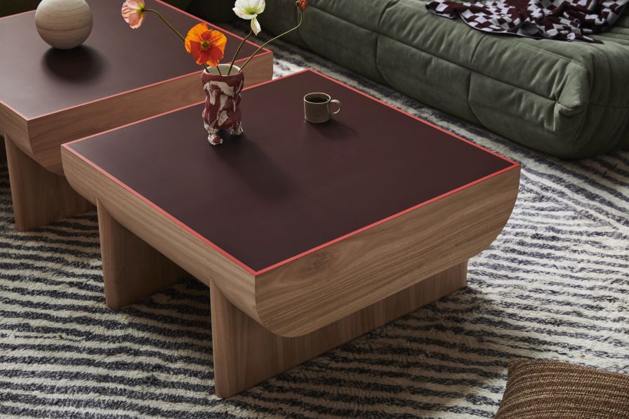 And adjoining the kitchen is a living room and study nook, which we’ll share with you here soon. Joachim was tasked with fabricating two matching coffee tables for this space, once again constructing MDF skeletons, but this time clad in Tasmanian oak veneer, and with solid Tasmanian oak at the foot of each leg. The tabletops feature a 10mm perimeter of brilliant red Laminex Pillarbox around a surface of dark, saturated red Laminex Kalamata. Joachim’s approach was to cover each tabletop completely in Pillarbox HPL, but only with adhesive around the edge, remove the centre with a router and then cut the Kalamata HPL to shape, trim it for a perfect fit and glue it into place. The result is stunning, and a testament to the skill and ingenuity of an experienced fabricator.