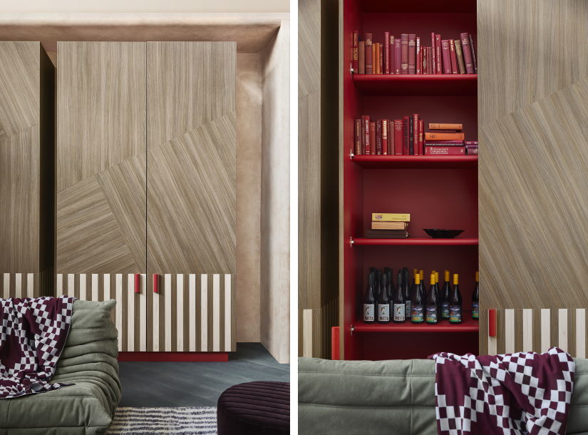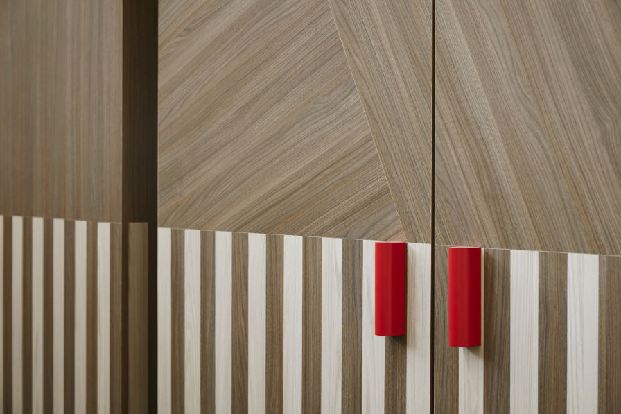The feeling here also comes down to the specific way that the colours and textures have been applied, often quite ingeniously harnessing the design flexibility of Laminex laminate. There’s tower cabinetry, for example, crafted from Laminex Danish Walnut and Milkwood, the two decors contrasted in an inlaid stripe pattern along the bottom edge, much like the kitchen island bench. The section above, however, is all Danish Walnut, with sheets laid at unexpected angles to create a dynamic sense of movement from the woodgrain. The cabinetry is further enlivened by curved linear door pulls post-formed from vibrant red Laminex Pillarbox high-pressure laminate (HPL). And inside, the interior is fabricated from Pillarbox, including post-formed shelves in an extra-thick bullnose profile. With the doors open, the brilliant red surfaces bring a whole new energy to the space.