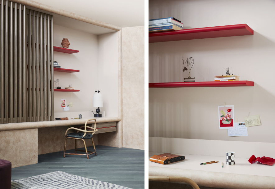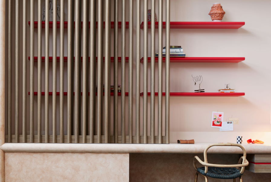 A little removed from the main lounge area is an increasingly essential inclusion in the home of 2021, the study nook. But far from presenting as an unsightly and intrusive home office, this study is seamlessly integrated with the rest of the room. It’s completely crafted from Laminex laminate, including vertical surfaces in that soft, warm Porcelain Blush, more of those brilliant Pillarbox bullnose shelves, drawers in Danish Walnut with another splash of Pillarbox on the inside surfaces, and perhaps most notably, operable screens with post-formed vertical blades, also in Danish Walnut. The screens slide to conceal working-from-home mess, but even when closed, their partial transparency creates a sense of visual interest and depth, another captivating moment in the room.